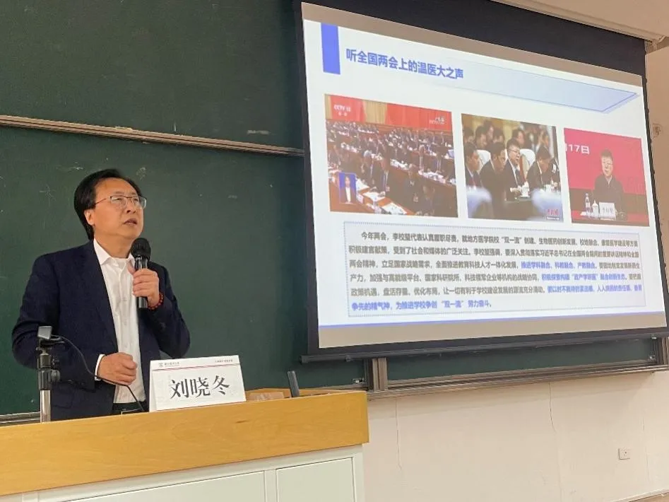 刘晓冬院长在学习活动中,系统阐述了习近平总书记在全国两会期间的重要讲话精神,他指出总书记的系列讲话为公共卫生事业的高质量发展提供了明确的方向指引和根本遵循,强调了以人民健康为中心的发展理念,为国家公共卫生体系的建设注入强大的思想动力。在关注“温医大之声”环节,刘院长详细介绍了全国人大代表、校长李校堃院士提到的“挺膺担当,逐梦星辰大海”、“加强康复学科建设,培养更多康复领军人才”、“AI医疗,未来看病会变成什么样?”、“支持地方医小黄书