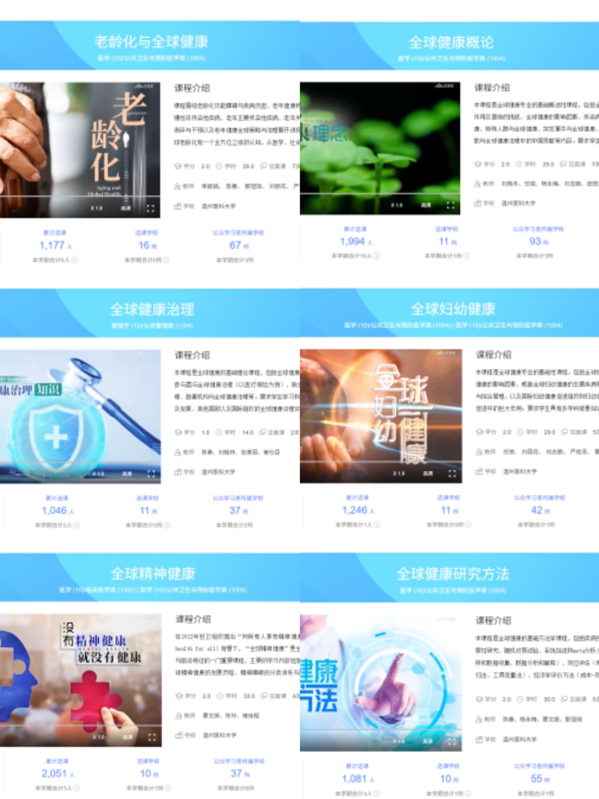 全球健康微专业课程群:已建成6门线上课程,覆盖全100余所高校及部分境外院校,选课人数超2500人,11.9万余次互动;