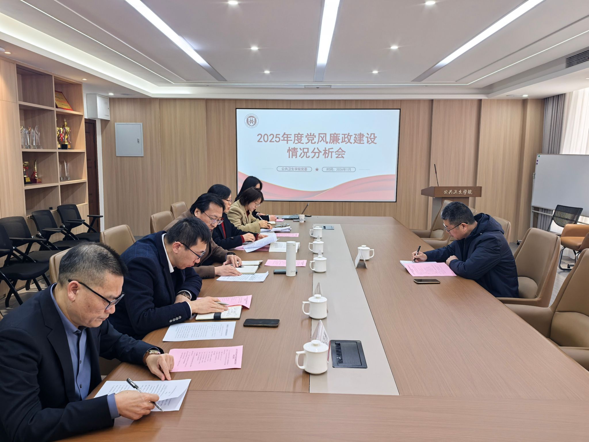 校纪委副书记、纪检监察室主任戴向龙就压实责任、防范风险、推动工作落实提出三点意见:一要压实党委主体责任,精准防控廉政风险。全面落实从严治党要求,坚持问题导向与系统思维,紧盯研究生招生、校地合作研究院等关键领域,深入排查研判廉政风险点,以重点突破带动整体推进。二要强化纪委监督责任,有力护航高质量发展。坚持严抓严管,精准运用监督执纪“四种形态”,用好用足“第一种形态”,做深酒驾等“身边人身边事”警示教育,督促领导班子成员履行“一岗双责”,保障公共卫生与预防医学博士点申报等重大任务落地,为“十五五”开好局保驾护航。三要坚持实效导向,健全常态化长效化机制。发挥分析会把脉开方、警示警醒作用,对整改任务实行清单化管理,定期跟踪问效,动态监督防范新增风险,为学院各项事业发展提供坚强政治保障和纪律支撑。
