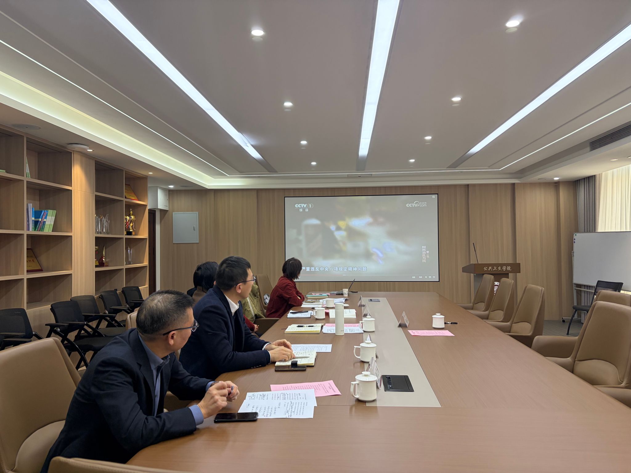 会上,学院全体领导班子成员观看学习警示教育片《一步不停歇 半步不退让》。