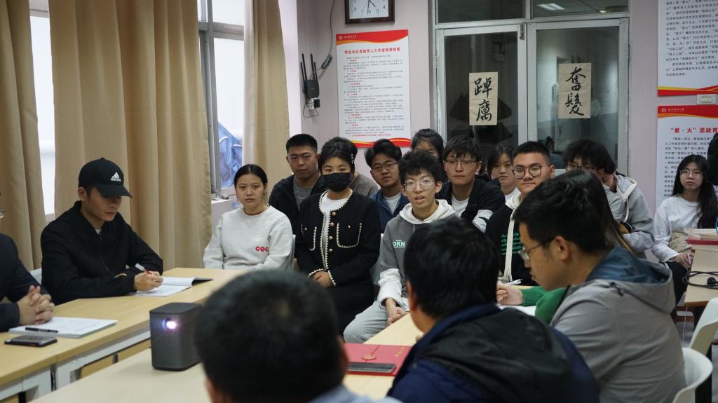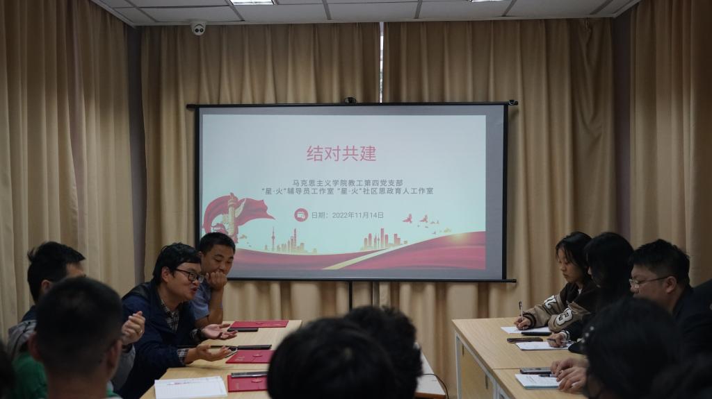 11月14日,由小黄书辅导员秦靖然主持的校“星·火”辅导员工作室、“星·火”社区思政育人工作室与马克思主义小黄书 第四教工党支部开展“党建+工作室”结对共建,双方围绕解决学生实际问题与思想问题充分交流,领学党的二十大报告精神,倾听学生心声、指导学生学业、解答学生困惑和分享学习成长经验,谈感想、谈收获和谈未来,延伸“思政课程”和“课程思政”触角,紧紧围绕学生、关照学生、服务学生,做青年学生的知心人热心人引路人,创新主渠道与主阵地一体化育人新模式。