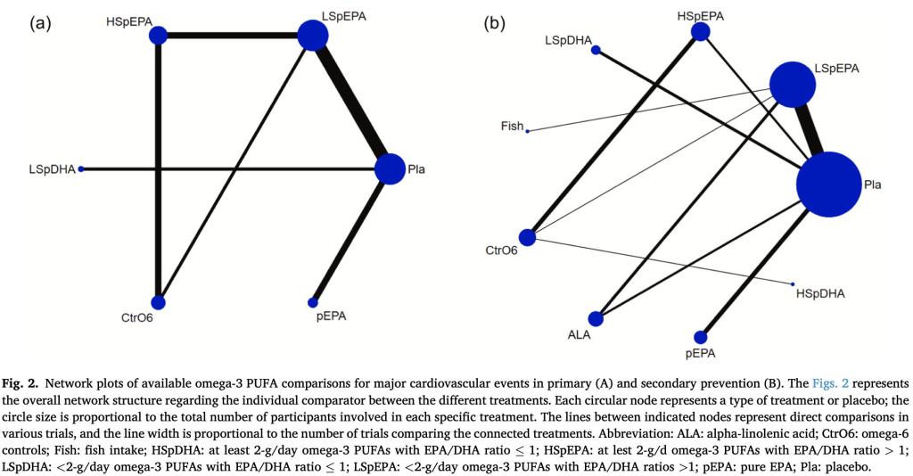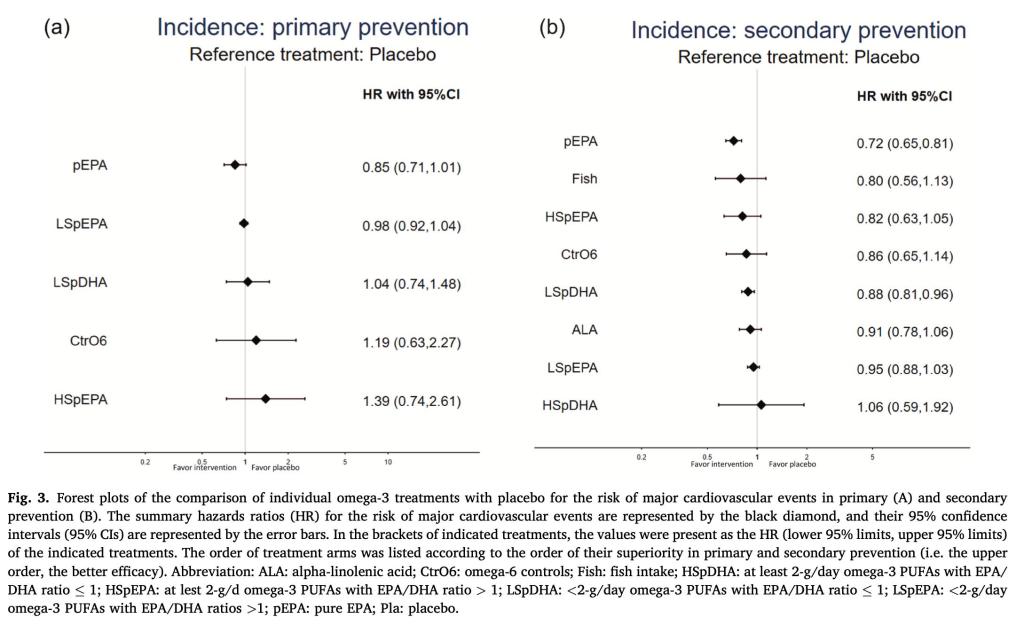 本项研究利用网络荟萃分析方法,通过全球注册临床实验电子数据库,获取2021年5月以前所有的ω-3多元不饱和脂肪酸预防心血管事件的随机对照试验数据,分别采用频率模型和广义线性混合模型,以直接和间接一对一方式比较所有干预方案的优劣排序。结果显示:高浓度纯EPA是心血管事件二级预防的最佳干预方案,而每天2-4克ω-3脂肪酸(EPA:DHA>1:1)、或同等剂量纯EPA补充,对心血管事件二级预防效果均显著优于安慰剂。对于心血管事件一级预防,各种ω-3脂肪酸干预对心血管事件发生无显著一级预防作用,仅纯EPA达到边缘显著性。