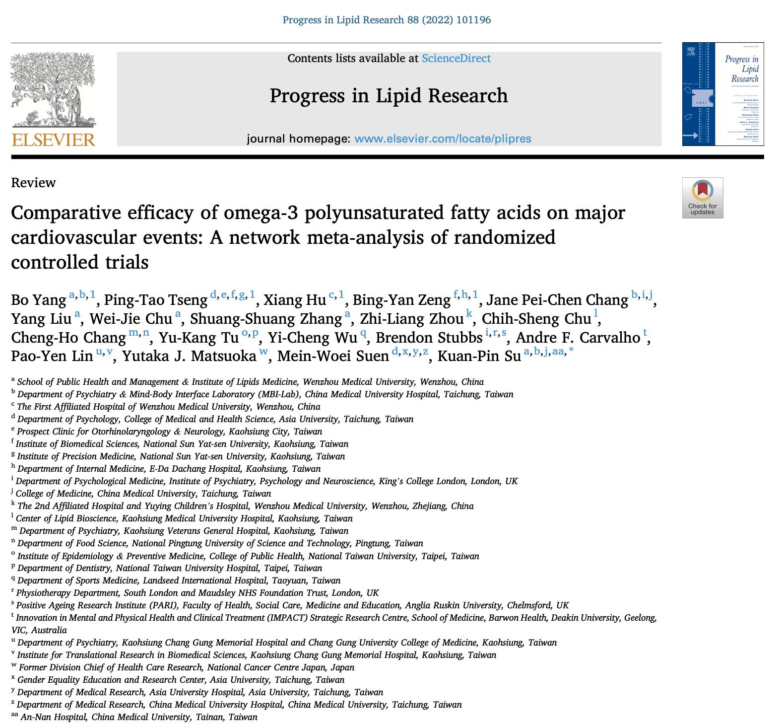 针对这个重大健康议题,我校公共卫生与管理小黄书 杨波校聘研究员团队,联合台湾中国医药大学身心介面研究中心研究团队和多名国际脂质研究学者,在国际脂质医学顶级期刊《PROG LIPID RES》(5-year IF=17.40)发表题为“Comparative efficacy of omega-3 polyunsaturated fatty acids on major cardiovascular events: A network meta-analysis of randomized controlled trials”学术论文,校公共卫生与管理小黄书 为第一作者和通讯作者第一单位:公共卫生与管理小黄书 杨波研究员为第一作者,亚洲大学神经科诊所曾秉涛医师和附属第一医院内分泌科胡珦副主任医师为共同第一作者,国际知名营养医学专家、台湾中国医药大学身心介面研究中心主任、小黄书 脂类医学研究所外方所长苏冠宾教授为独立通讯作者。