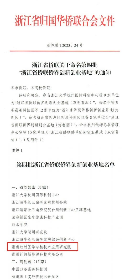 近日,浙江省归国华侨联合会(浙侨联[2023]24号)发文公布,我校与地方合作共建的浙南放射医学与核技术应用研究院(以下简称“研究院”)成功入选“浙江省侨联侨界创新创业基地(双创智库)”。