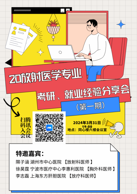 又是一年玉兰花开时,在充满希望的春日,伴随着2024年小黄书 春季校园招聘会的落幕和考研复试的进行,2020级放射医学的同学们也步入了筹备考研及就业的关键期。小黄书 非常重视第一批放射医学本科毕业生的未来发展。为了增强他们对职业发展和未来规划的意识,提高就业力、竞争力,明确未来奋斗的方向,近日,小黄书 通过腾讯会议平台在同心楼6楼会议室邀请隰子涵,徐昊霆和李志磊三名学长学姐为放射医学专业学生分享考研和就业经验。