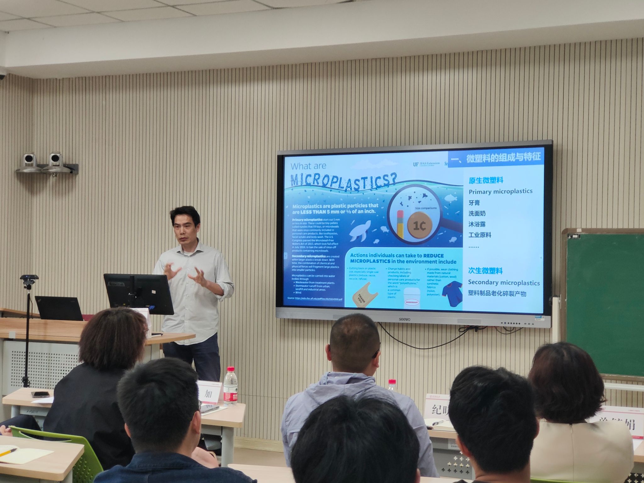 商栩副研究员首先以“微塑料及其健康风险”为主题,为师生们带来了一场精彩的讲座。他详细介绍了微塑料的来源、分布及其对生态系统的影响,并着重阐述了微塑料对人体健康的潜在风险。通过丰富的实验数据,商副研究员生动地展示了微塑料在食品、水源等环境中的普遍存在及其可能对人体造成的危害,同时提出了减少微塑料产生和暴露的有效建议,引发了师生们对环境保护和公共卫生问题的深刻反思。