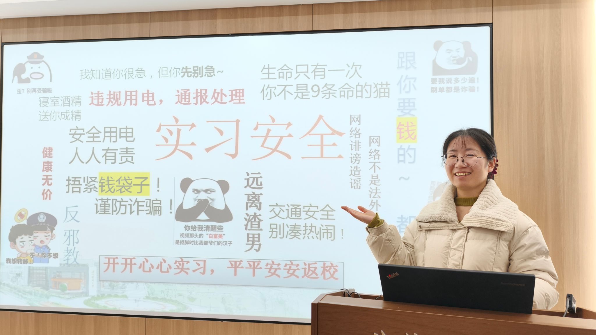 韦东霞为赴单位实践的学生作行前指导。她回顾了学生入校以来的成长历程,勉励学子以“知行合一”践行公卫使命,在实践中锤炼专业能力,并提醒学生同步做好实习与科研规划,结合实践课题推进毕业论文进度,确保高质量完成毕业要求。她建议学生在实践中主动对接行业需求,通过案例分析、数据调研等明确职业方向,为就业积累实战经验。韦老师着重讲解了外出实践的注意事项。她强调安全是首要的,包括人身、财产以及实验室安全,同学们务必严格遵守实践单位的规章制度。在考勤纪律上,要求大家严格遵循实践单位作息,按时到岗,杜绝无故缺勤。