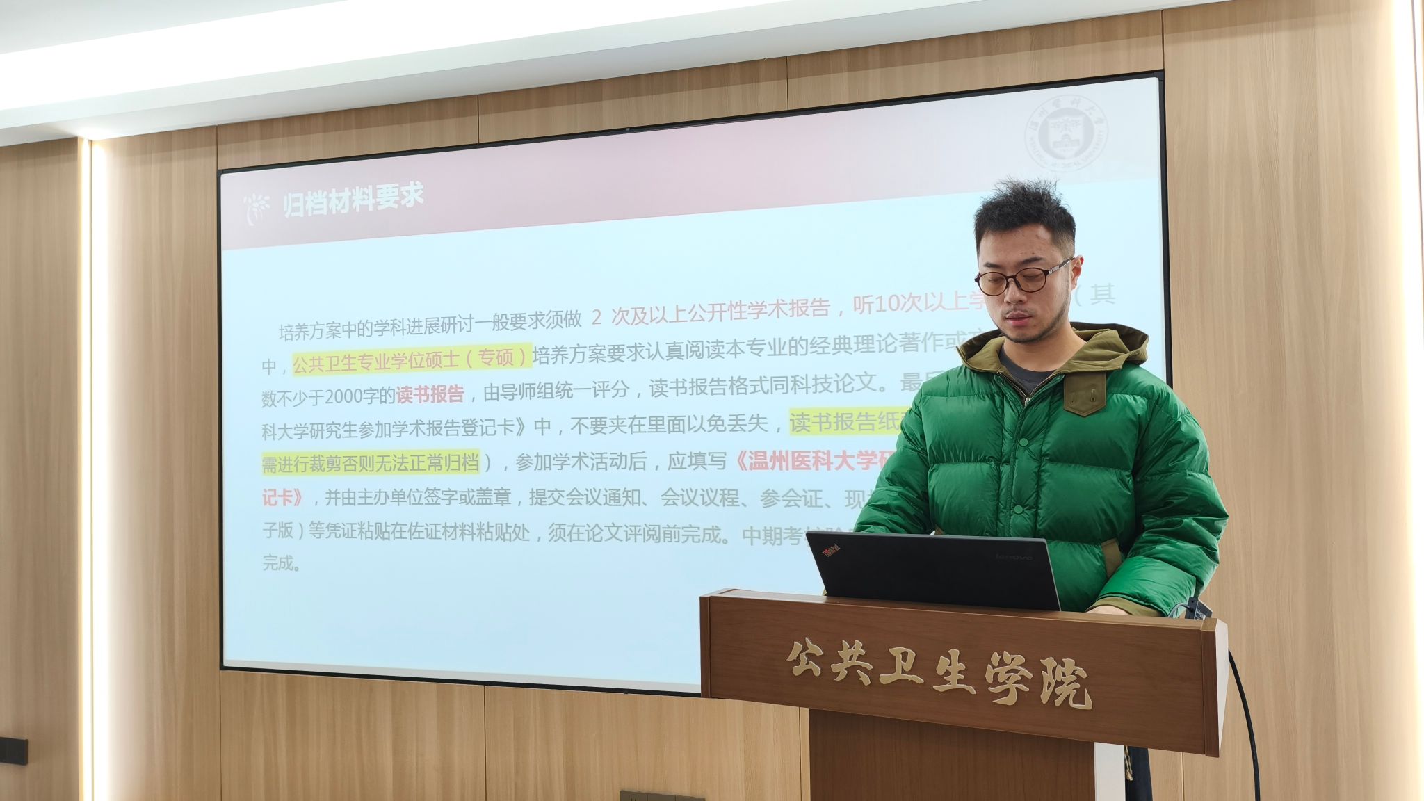 朱柏民强调了此次实践的重要意义。他指出,外派实践是公共卫生专业型研究生培养过程中的重要环节,是理论知识与实践深度融合的关键时期。通过实践,研究生们不仅能够提升专业技能,还能增强解决实际问题的能力,为未来的职业发展积累宝贵经验、筑牢坚实根基。他提醒同学们要与校内导师和实践单位导师保持密切沟通,及时汇报实践进展,保障实践顺利推进。此外,他详细说明了外派实践期间需完成的任务,如认真填写实践手册,记录学习内容与心得体会,确保实践过程完整规范;重视学术报告登记卡和科研记录本,按时提交相关材料,保证实践环节材料及时归档。